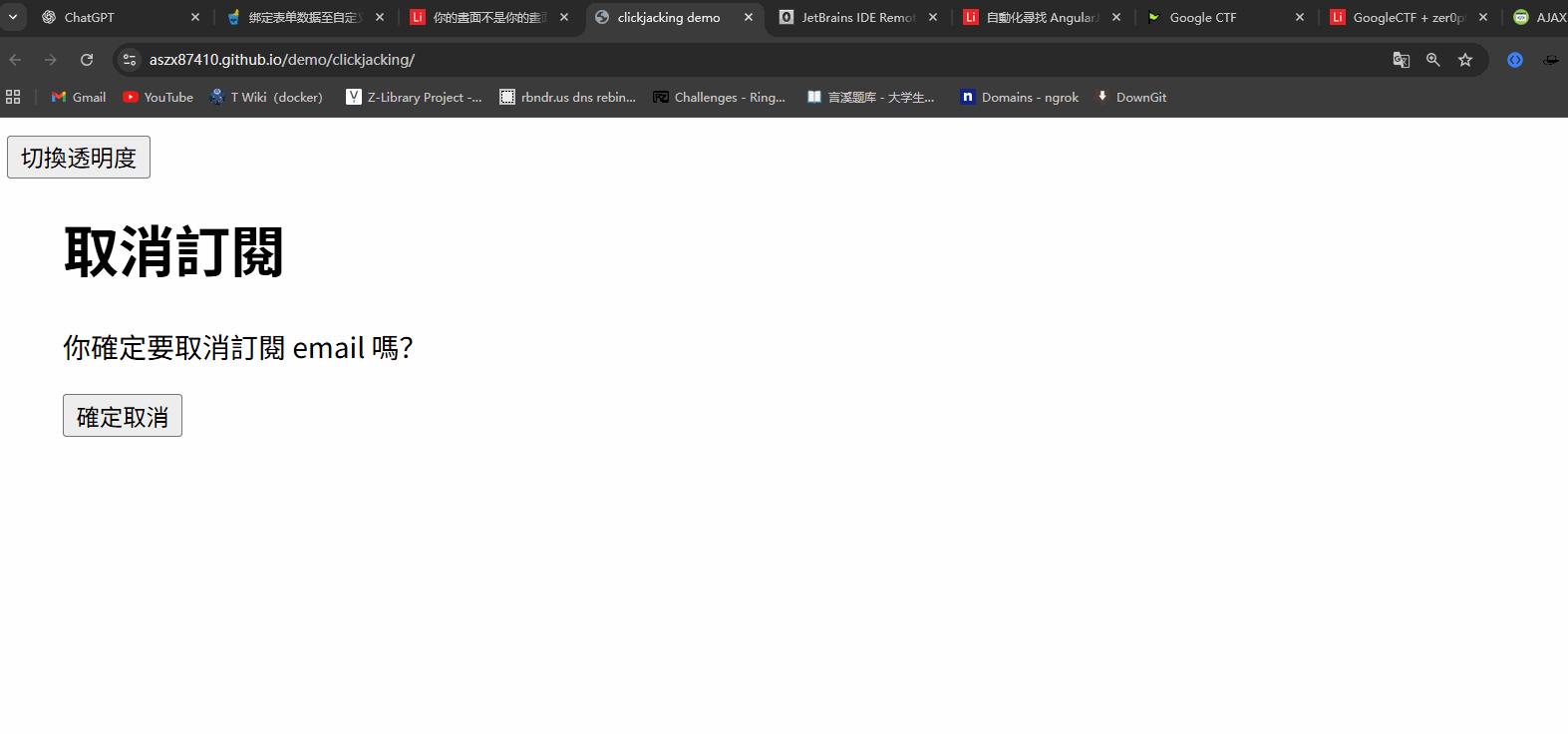 ClikeJacking的原理其实很简单,透过css嵌套一个页面进一个主页面,例如在A中放一个B页面,可以利用iframe等方法,然后利用css将其的透明度设置为0.001,这个时候如果用户A点击某个按钮,就会点到B页面的按钮,例如这样子clickjacking 范例